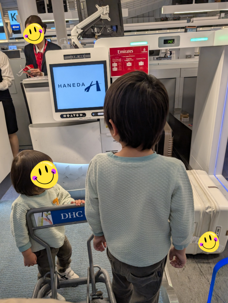 日本は冬だったため、パジャマを着せて上からコートを羽織り、羽田空港へ。