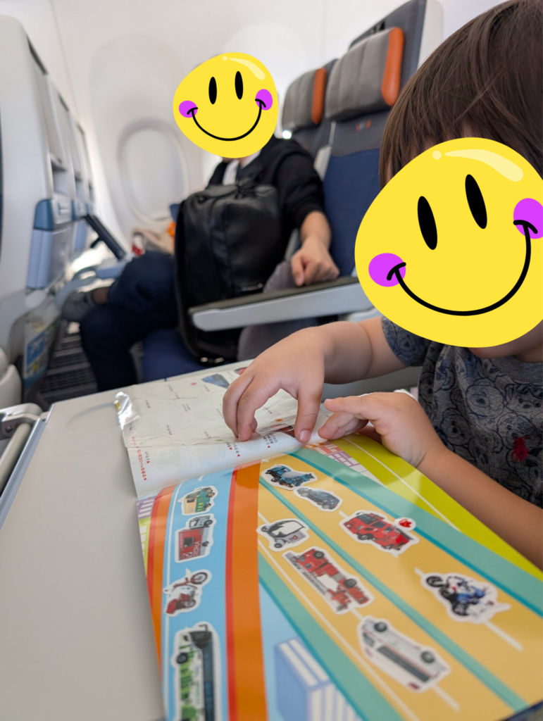 日本発のエミレーツ航空は、子ども向けのエンタテインメントも充実しており、あまり必要ないかな?と思いましたが、ドバイ→マーレ(モルディブ)のフライトではシールブックとタブレットが活躍しました。