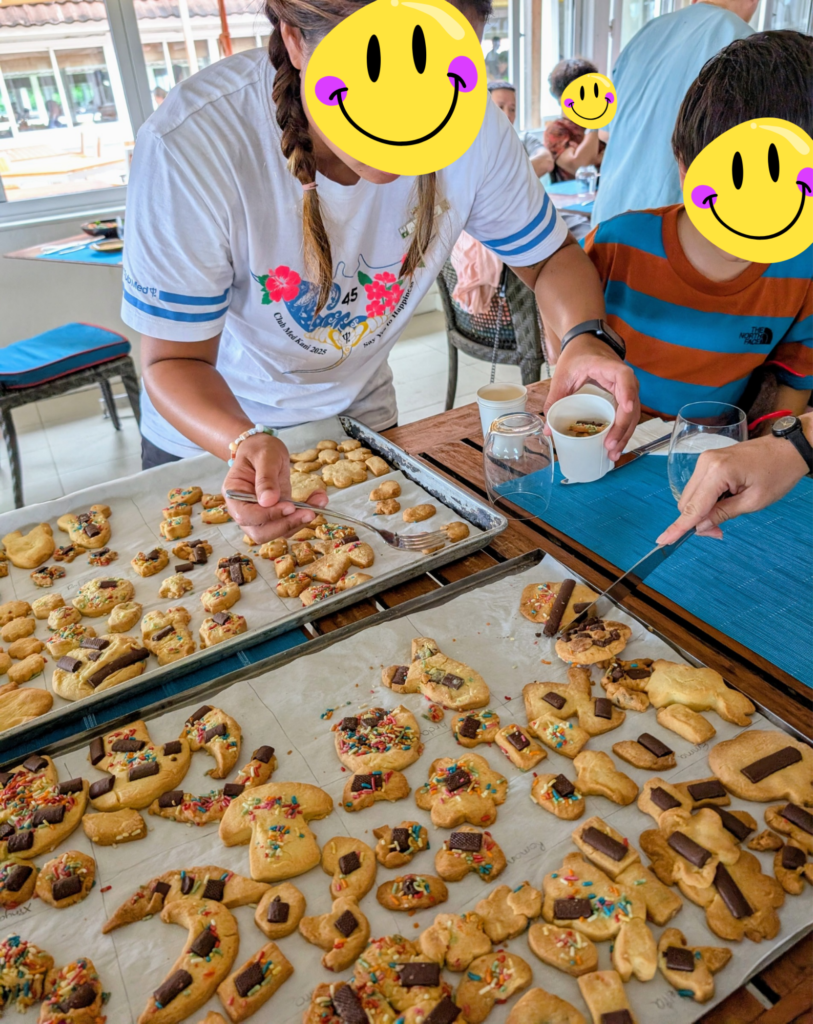 焼きあがったクッキーと餃子は、ランチの時間にレストランで受け取りました(自分が作ったものに印をつけてくれています)