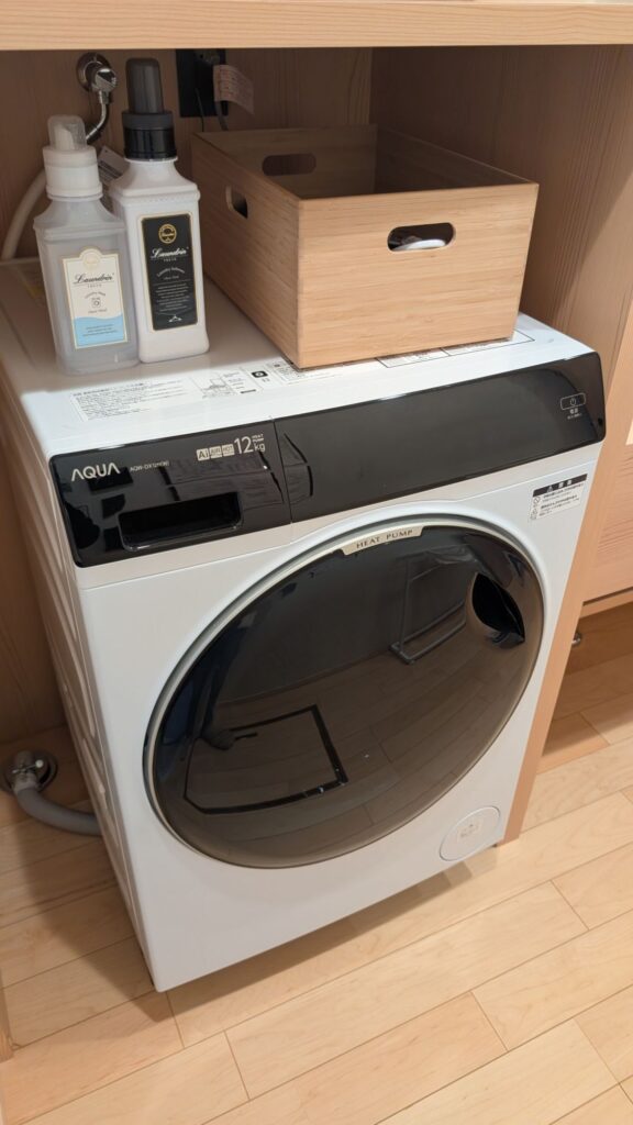 乾燥機付きですが、かなり少量でないと乾きが甘かったので、お部屋の乾燥防止も兼ねてリビングに干しました☺️