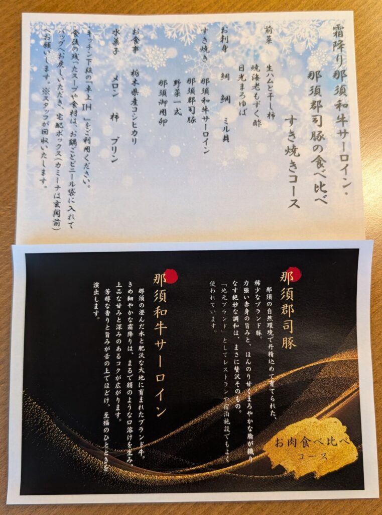 メニューは「すき焼き」を選択。チェックイン時に、すでに食材が部屋に届いていました。(保冷剤入りのクーラーバッグに入っていました)