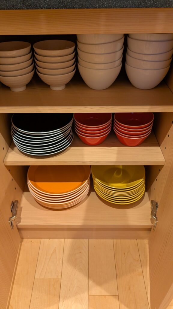 続いてはキッチンの備品です。棚を開けると、コーヒーやカップ類、電子レンジ、お皿にカトラリー類と一通り揃っていました。