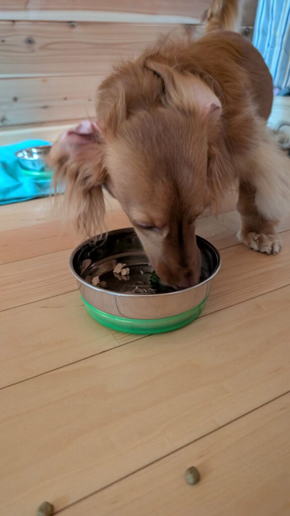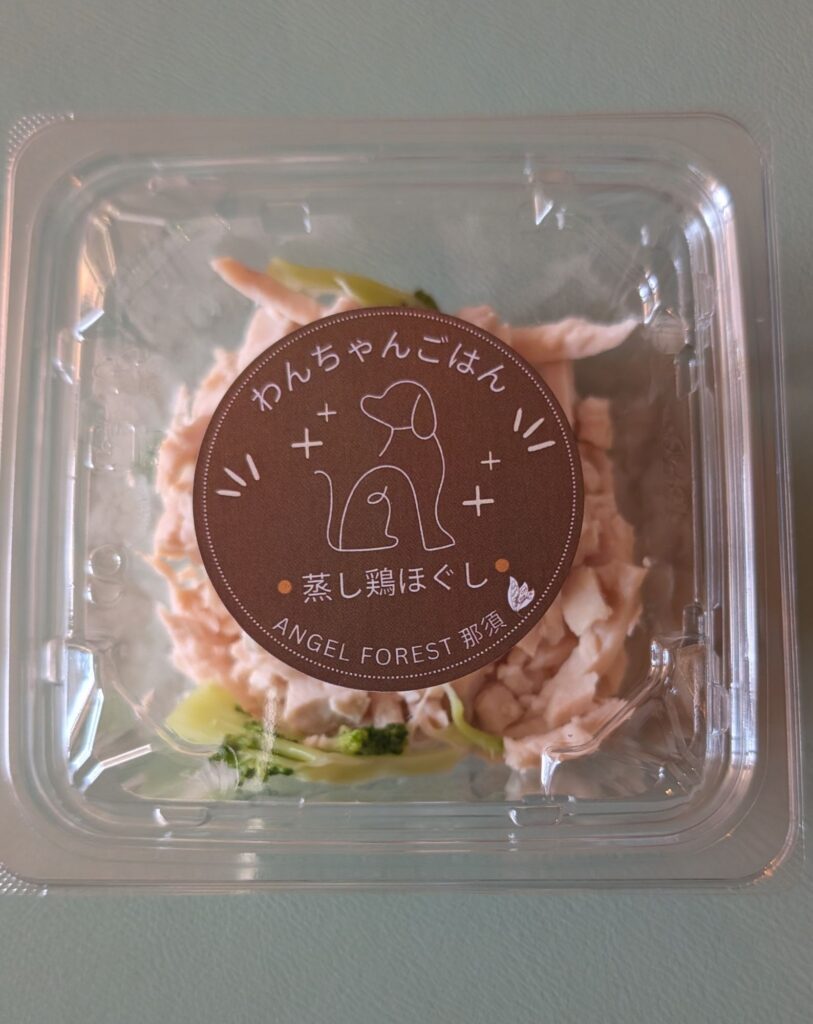 朝ごはん、ワンコ用は「蒸し鶏ほぐし」でした。