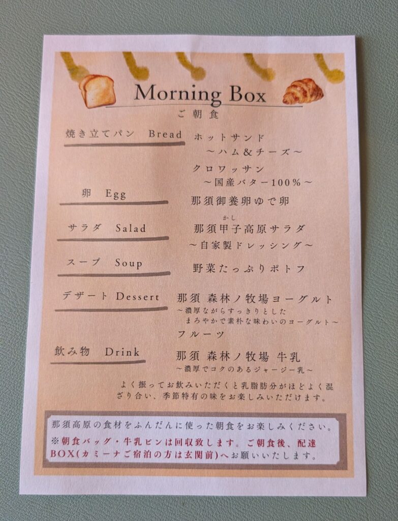 朝ごはんは、指定した時間に宅配ボックスに入れてチャイムを押して行ってくださいます。