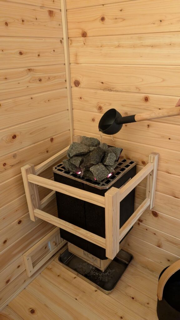 帰る間際ですが、初ロウリュも体験してみました。ジュワ〜っと蒸気が立ち、温まります。