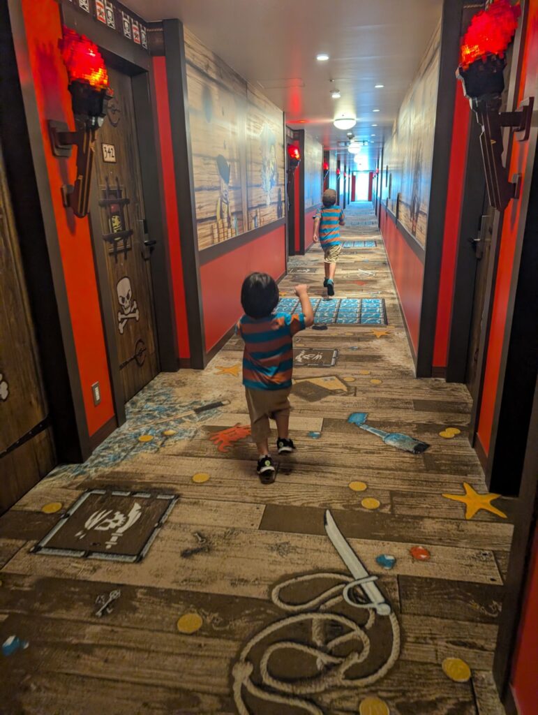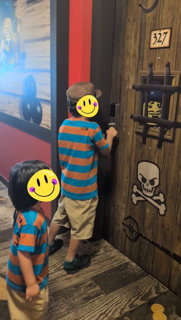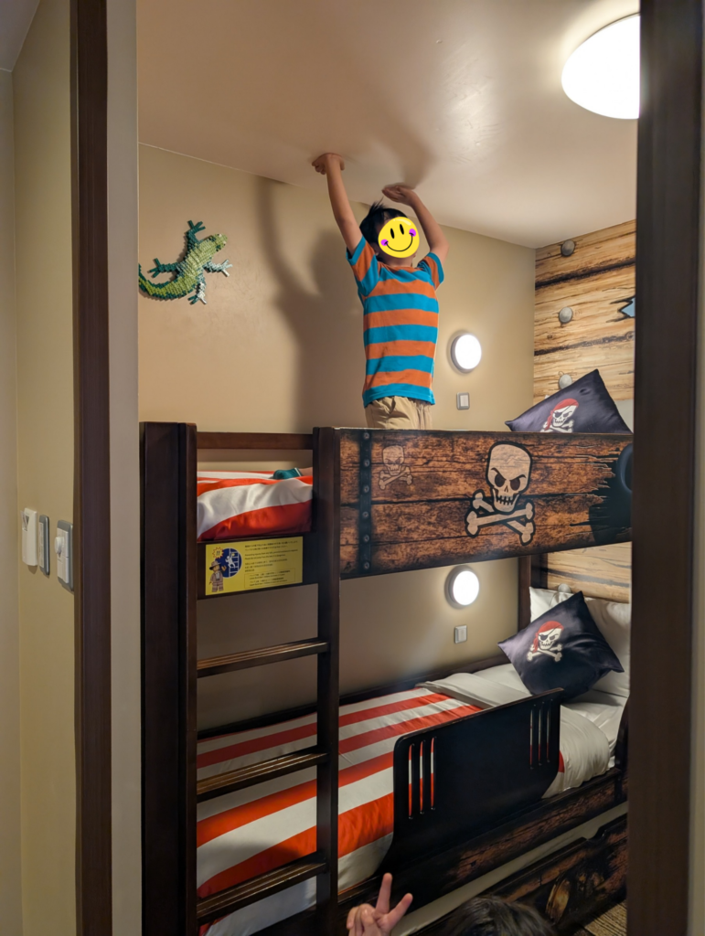 お部屋は2タイプあるようで、私たちのお部屋はプレイルームタイプでした。部屋は海賊をテーマにしていて、壁や家具の装飾がとてもかわいく、子どもが喜ぶ仕掛けがたくさんあります。