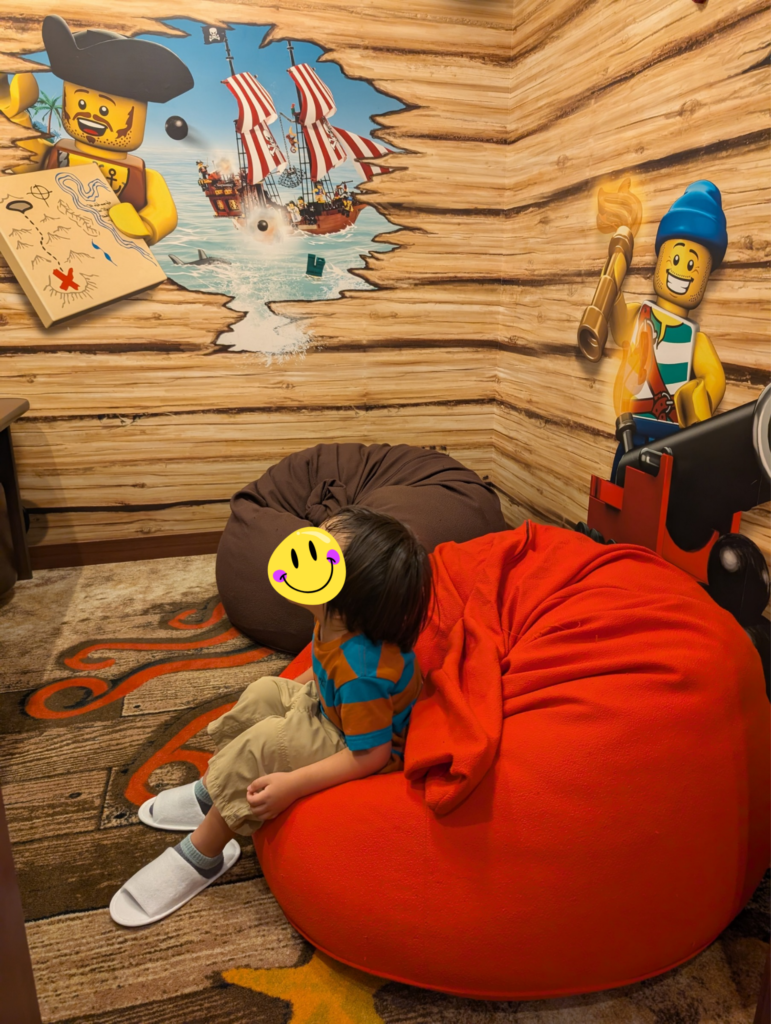二段ベッドの下にはレゴデュプロ、プレイルームのテレビではレゴの映画が流れていました。