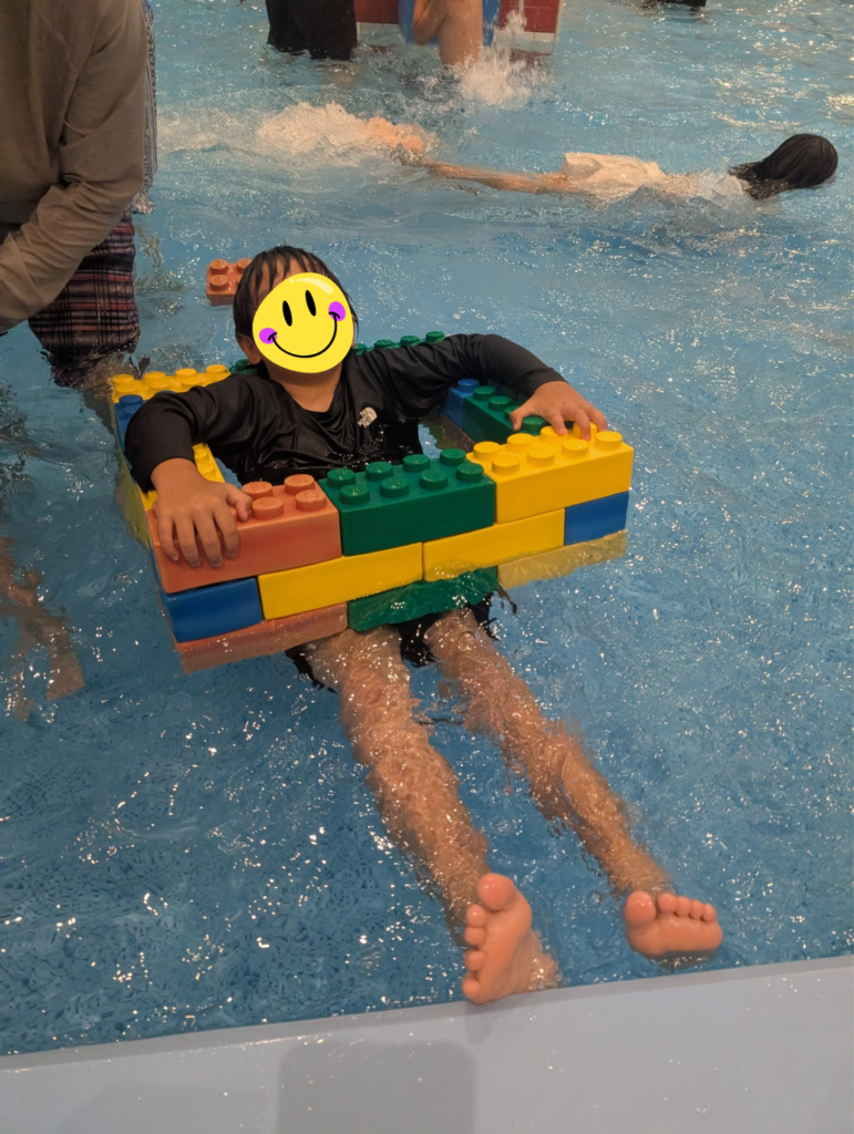 長男あっちゃんは、いつも浮き輪でプールにプカプカ浮くのが好きなので、レゴで作った浮き輪でのんびり流れていました😄