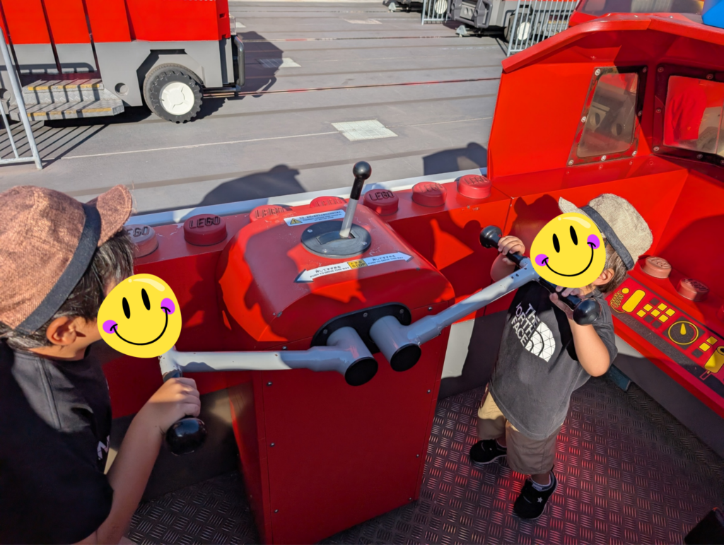 レバーを上げ下げして消防車を動かし、現場に到着したら消火活動をします。結構力が必要で、オトナも疲れました。