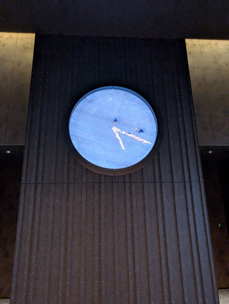 ↓ロビー付近で特に面白かったのがこの時計!作業員がゴミをブラシで動かしながら、時計の針を表現しています。
